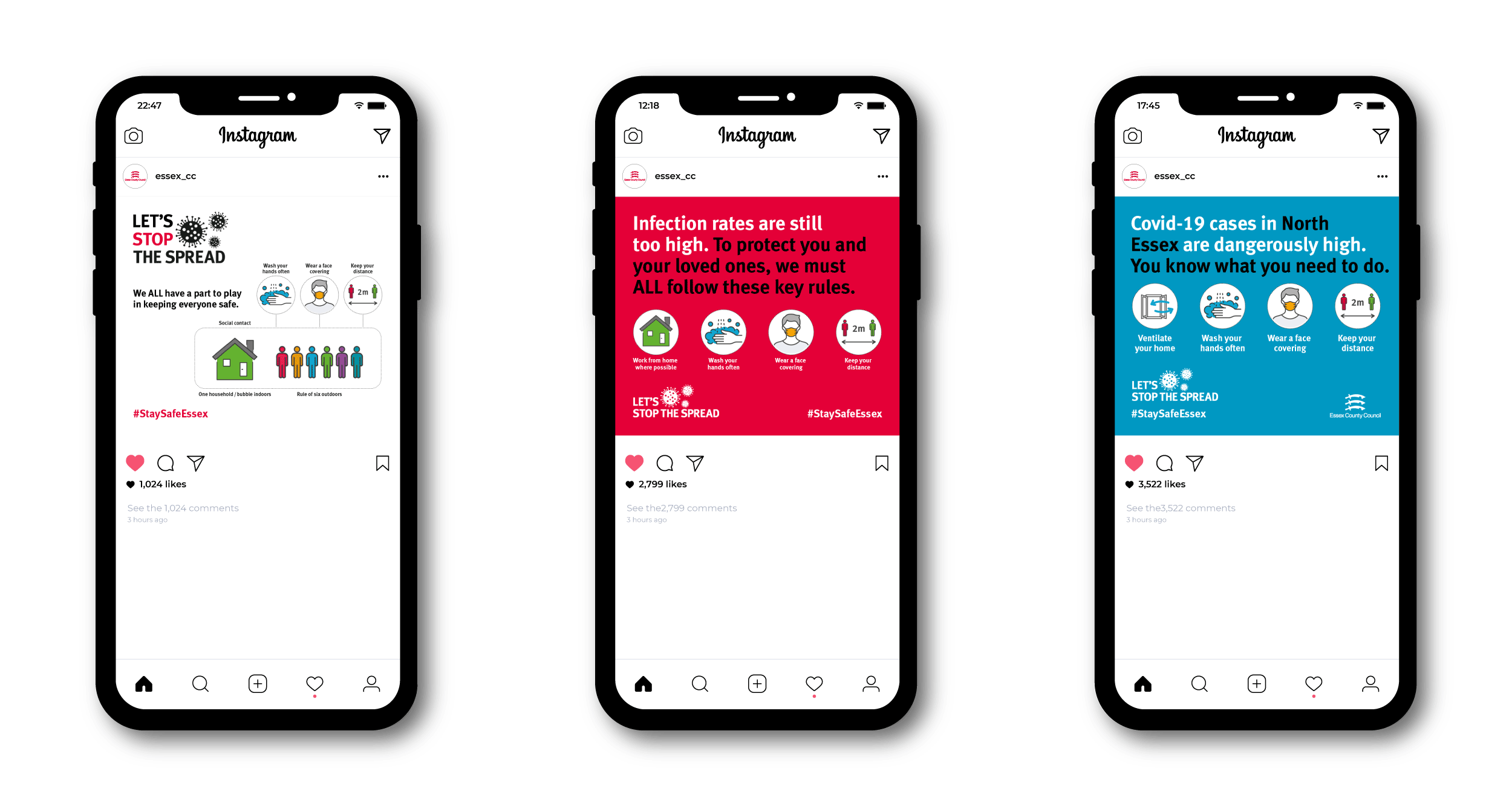 Static infographics were posted on social media to encourage behavior changes and remind people of good hygiene practices. Animated MP4s were used for more complex messages, showing preferred actions in a visual format. These efforts were complemented by printed materials, including newspaper ads and informational leaflets sent to every household in Essex.
