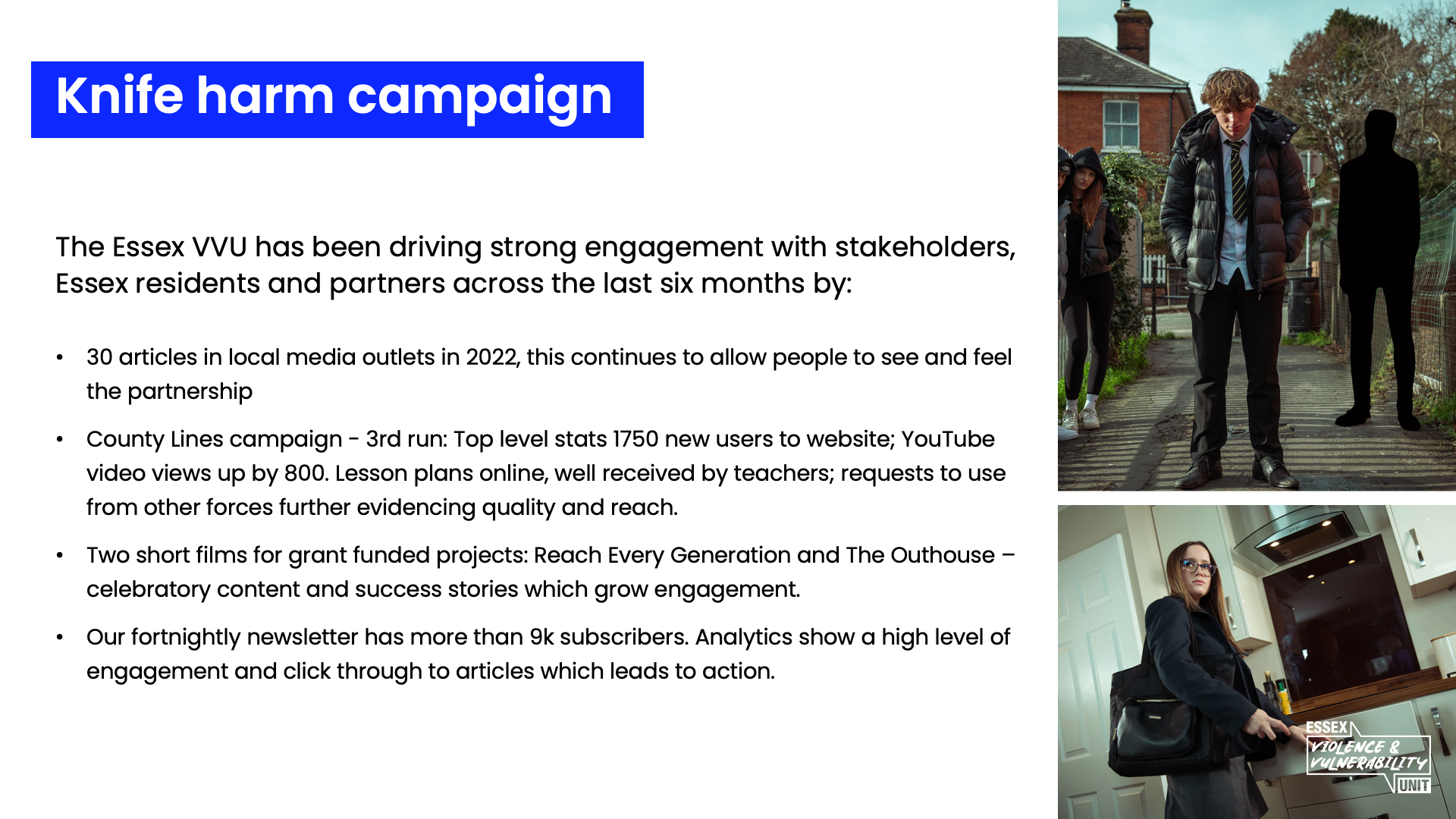 The Essex Violence and Vulnerability Unit (EVVU) was set up in 2019 to support direct work with young people at risk of violence, provide training and development to those who are on the front line and raise awareness with the general public about the dangers of County Lines.