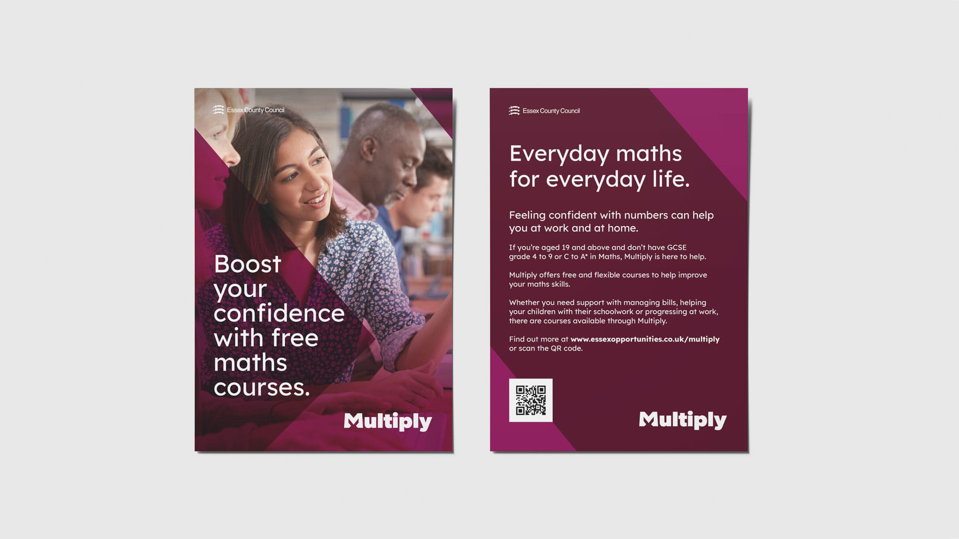 Multiply in Essex was a £7.9 million county-wide campaign aimed at raising skills in maths for adults aged 19 and over. The first phase of the campaign focused on raising awareness of Multiply and encouraging enrolment. While the second focused on helping people acquire and integrate maths skills into their daily lives, whether it is progressing in their careers, managing their finances, helping their children with school work or just feeling more confident about working with numbers.
